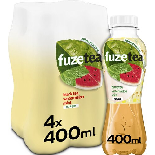 Fuze Tea Black Tea Watermelon Mint is een fusie van duurzaam geteelde zwarte thee, muntextracten en een hint van watermeloen. Dit drankje bevat geen suiker en is verkrijgbaar in een fles gemaakt van 100% gerecycleerd plastic.