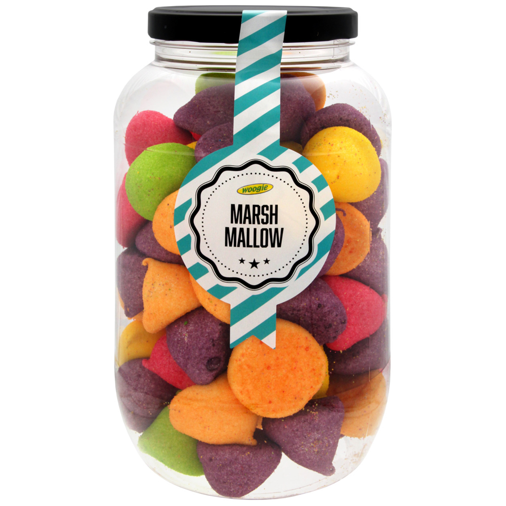 Geniet van de kleurrijke verscheidenheid aan verschillende marshmallows van Woogie. Verpakt in een praktische, hersluitbare plastic Pet-fles. 780g.