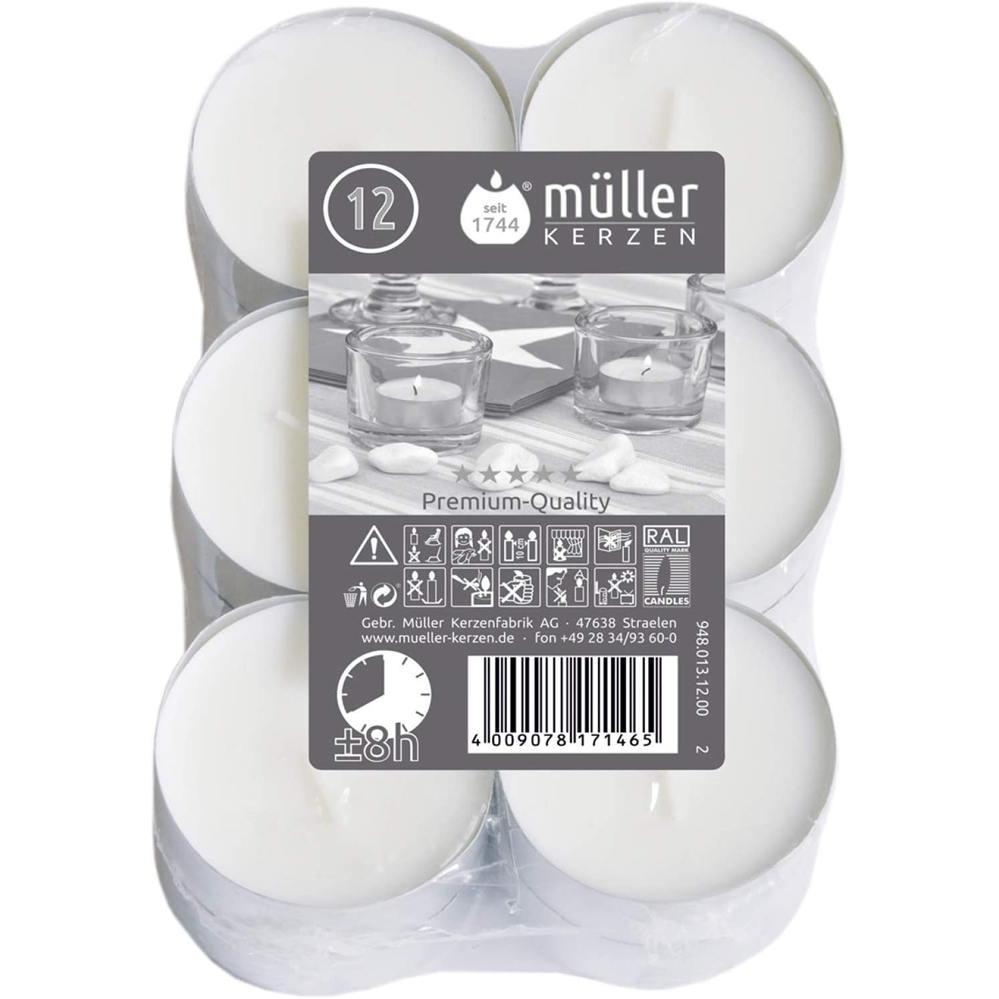 Maxi theelichtjes van Müller. 12 stuks. Diameter: ca. 6 cm. Brandduur: ca. 8 uur.