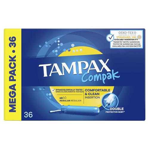 Tampax Compak Reguliere tampons bieden je discrete bescherming bij lichte tot middelmatige menstruaties. Tampax Compak-tampons bieden menstruatiebescherming in een zeer handig formaat. Ze zijn geur- en kleurstofvrij. Tampax Compak-tampons hebben een compacte plastic applicator en een afgeronde punt voor eenvoudig en comfortabel inbrengen.