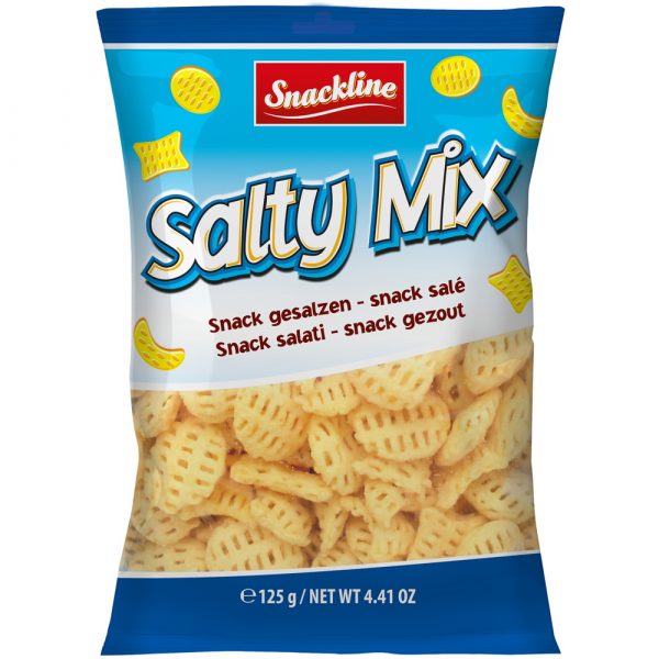 Salty Mix van Snackline is de aardappelsnack voor grote en kleine snackfans! De verpakking bevat 125g.