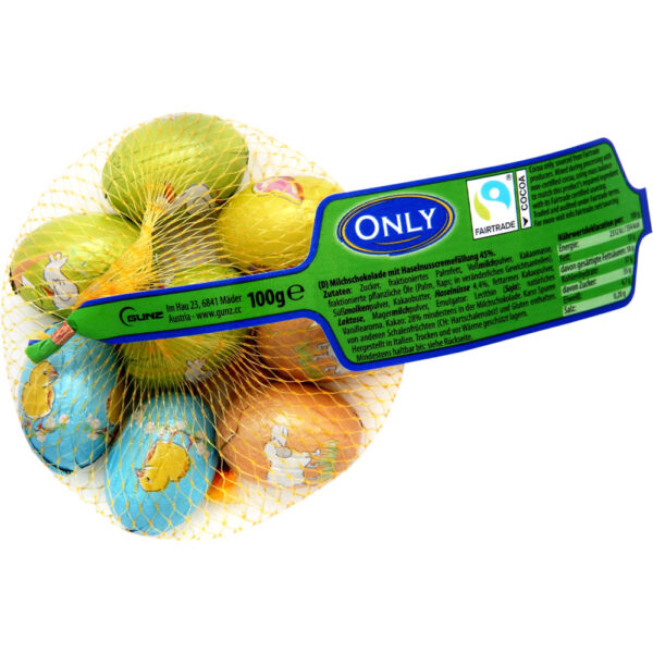 Een zakje met melkchocolade eitjes met hazelnootvulling. 100g.
