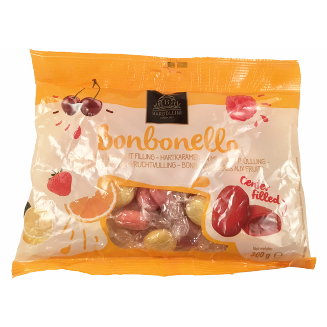 Bonbonbello – harde snoepjes met vruchtvulling. Mix van sinaasappel, kers, citroen, aardbei en frambozensmaak. 300g.