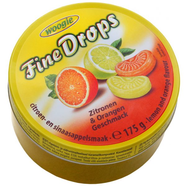 Harde karamellen met sinaasappel- en citroensmaak van Woogie. 175g.